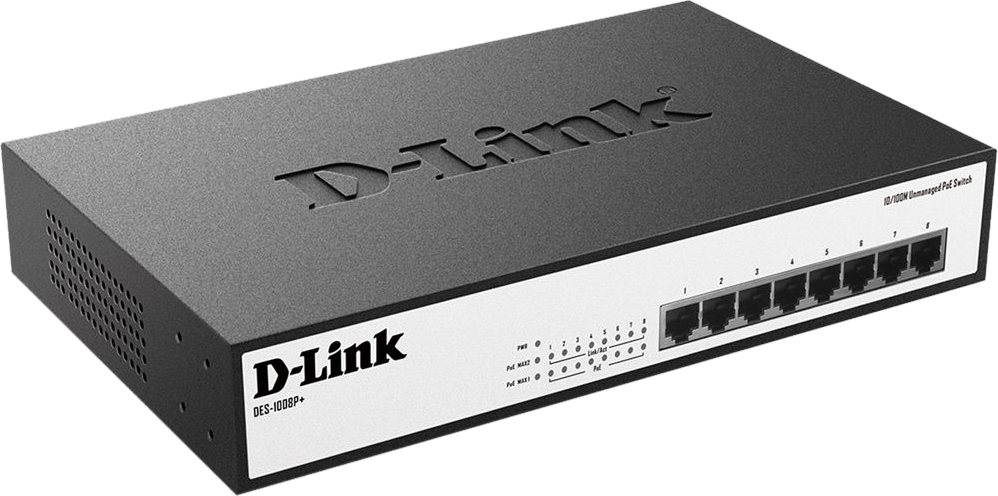 Коммутатор D-Link DES-1008P+ имеет на борту восемь портов Ethernet 10/100 с поддержкой PoE 802.3af/802.3at (30 Вт), PoE-бюджет 140 Вт