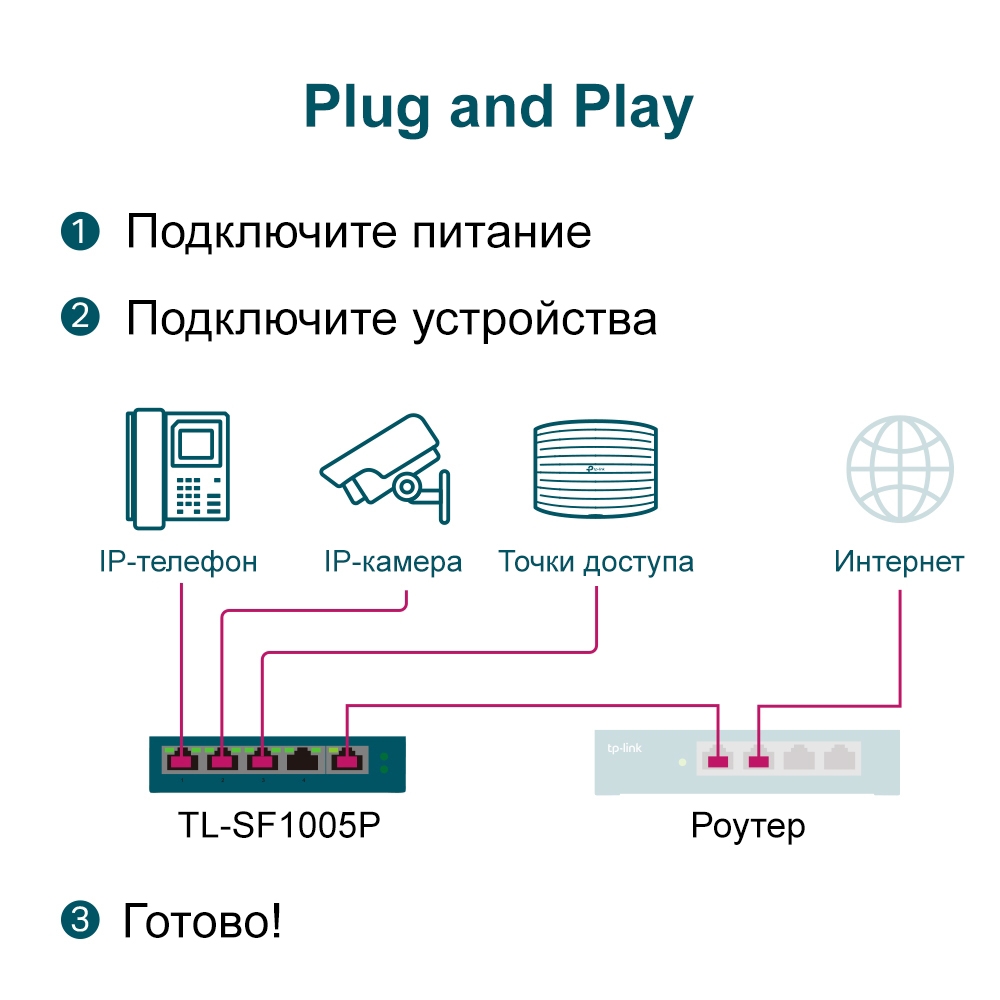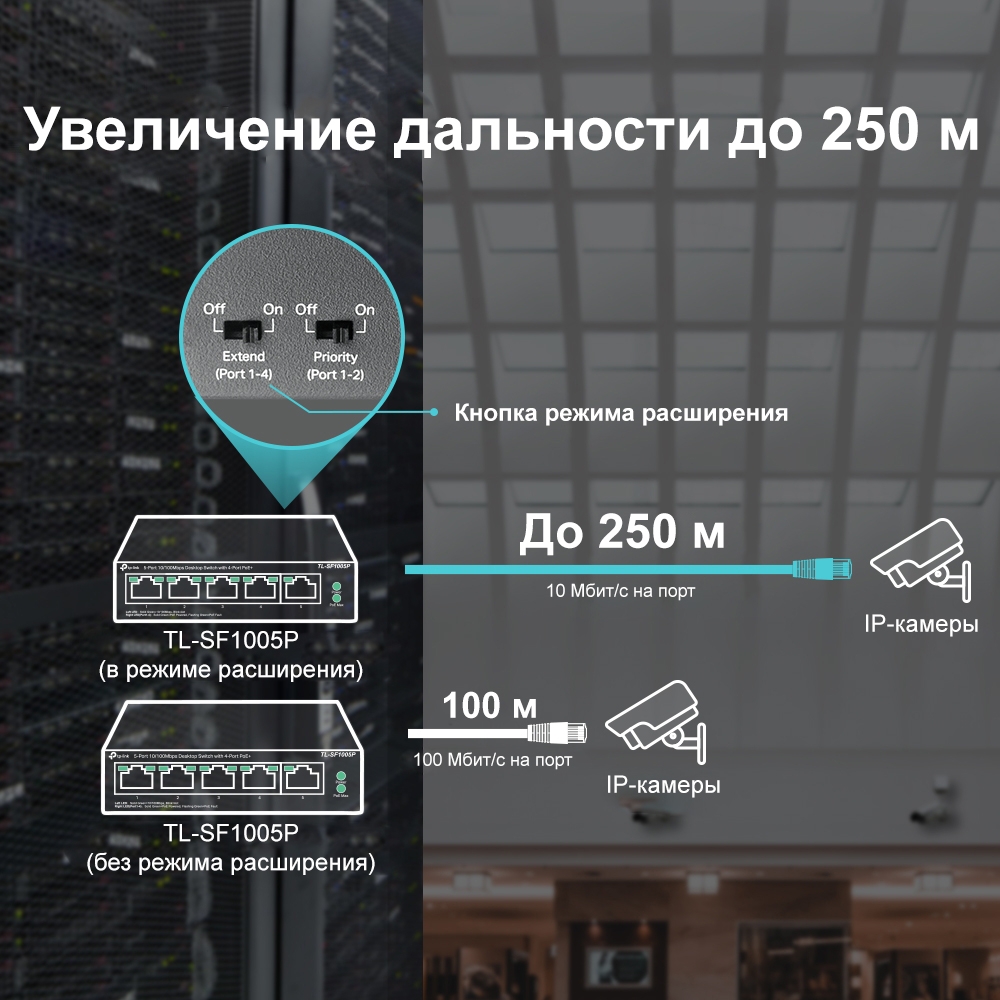 TP-Link TL-SF1005P Благодаря соответствию стандарту PoE+ 802.3af/at каждый порт PoE+ поддерживает до 30 Вт, а общий бюджет PoE 67 Вт* для 4 портов PoE открывает широкий ряд возможностей, например, позволяет создать видеонаблюдение для офисов, общежитий и малого бизнеса.