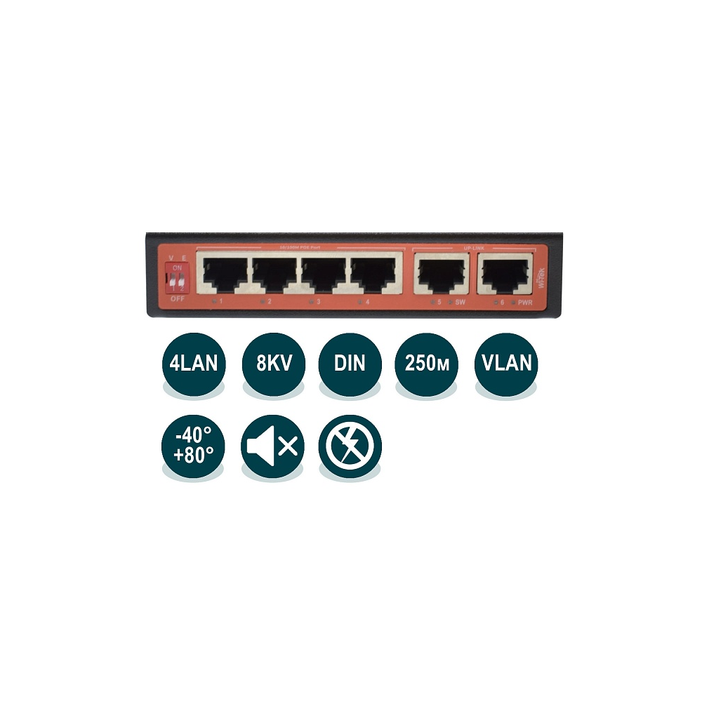 Коммутатор Wi-Tek WI-PS206-I, 6 Eth 10/100, 802.3af/at PoE out, порты PoE out 4