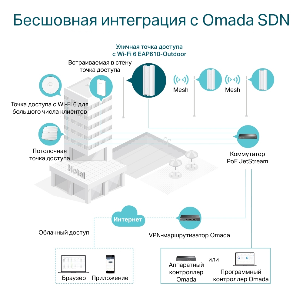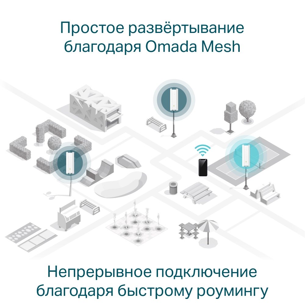 Корпоративная точка доступа TP-Link EAP610-OutdoorБлагодаря Wi-Fi 6 совокупная скорость Wi-Fi двух диапазонов TP-Link EAP610-Outdoor составляет до 1,8 Гбит/с, при этом скорость передачи данных увеличена и на 2,4 ГГц, и на 5 ГГц, что позволяет размещать точку доступа в местах с высокой плотностью клиентов, например, в уличных кафе или в парках.