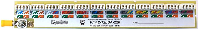 Грозозащита РГ4.2-12LSA - это групповой модуль защиты на 12 линий для сетей 10/100Base-TX.Грозозащита РГ4.2-12LSA подключается к кабелю с помощью коннектора LSA, а к оборудованию,с помощью розетки RJ-45.